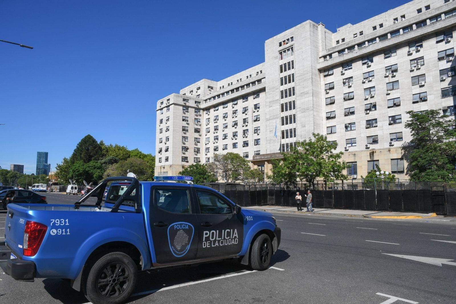 El frente se encuentra absolutamente vallado, sin la posibilidad de ingreso y todos deben entrar por el acceso de la calle Letonia, mientras que por esa calle se vio la presencia de carros de asalto, ambulancias y el Escuadrón anti bombas de la Policía Federal.