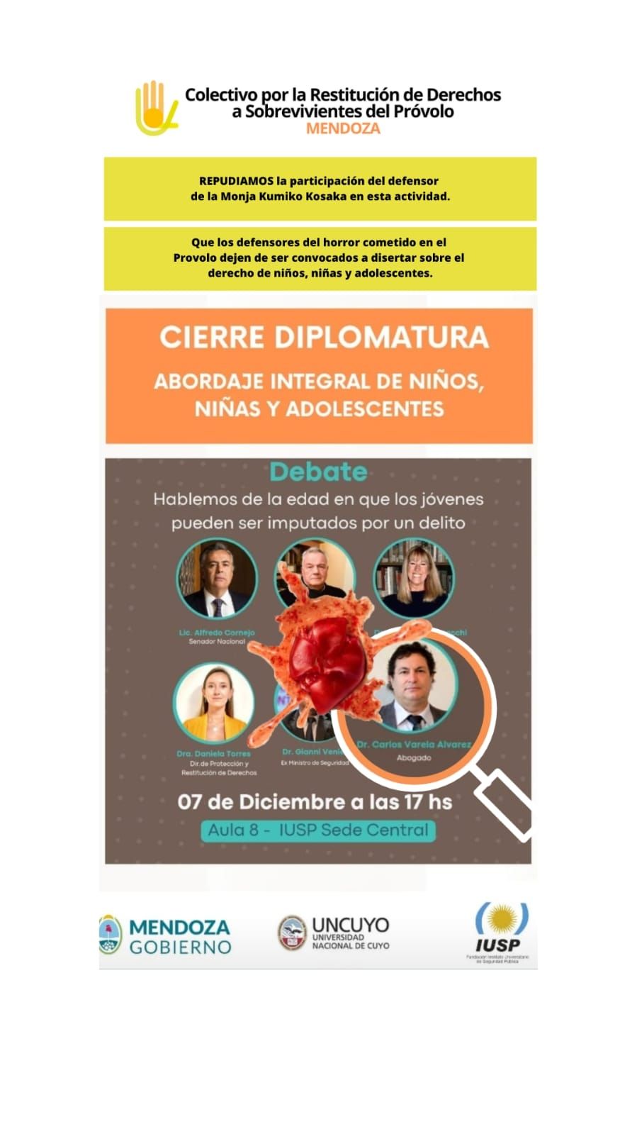 El flyer que circuló por redes sociales mostraba al panel que será mañana miércoles 7 a las 17 en el Aula 8 del Instituto Universitario de Seguridad Pública con un tomatazo, mostrando el repudio. Luego, el abogado contó a través de una carta pública que fue cancelado.