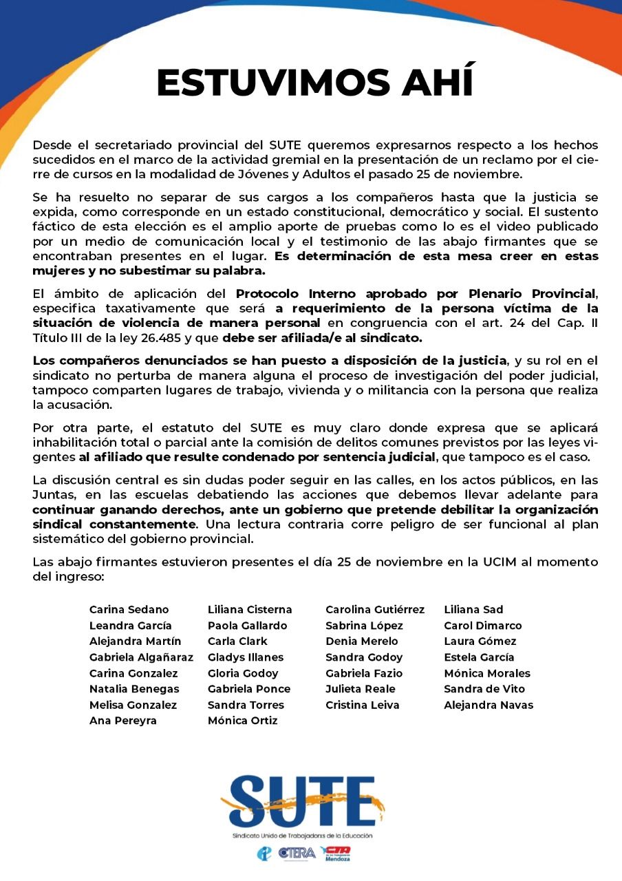 Además, agregan en el texto que: “El ámbito de aplicación del Protocolo Interno aprobado por Plenario Provincial, especifica taxativamente que será a requerimiento de la persona victima de la situación de violencia de manera personal en congruencia con el art. 24 del Cap. II Titulo III de la ley 26.485 y que debe ser afiliada/e al sindicato" . Es decir como la denunciante no es una afiliada, el protocolo no corresponde, de acuerdo afirman las mujeres de la conducción. El texto que circuló en las últimas horas asegura también que: "Los compañeros denunciados se han puesto a disposición de la justicia, y su rol en el sindicato no perturba de manera alguna el proceso de investigación del poder judicial, tampoco comparten lugares de trabajo, vivienda y o militancia con la persona que realiza la acusación.Por otra parte, el estatuto del SUTE es muy claro donde expresa que se aplicará inhabilitación total o parcial ante la comisión de delitos comunes previstos por las leyes vigentes al afiliado que resulte condenado por sentencia judicial, que tampoco es el caso”.