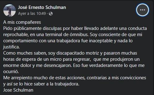 El dirigente utilizó sus redes sociales para pedir disculpas por su comportamiento. "Soy consciente de que mi comportamiento con una trabajadora fue inaceptable y nada lo justifica", aseguró.