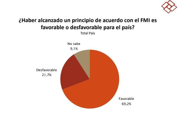 En este sentido, el informe distribuido el fin de semana indica que el acuerdo con el FMI tiene un apoyo del 69,2%; un porcentaje mayor que cualquier dirigente del oficialismo o la oposición, a la vez que cualquier política que esté llevando adelante el Gobierno nacional. Sólo un 21,7% de los consultados está en desacuerdo y el 9,1% no responde. Ese 69,2% de apoyo, curiosamente, no se traduce aún en un nivel porcentual similar de votos positivos proyectados en el Congreso Nacional, donde aún el oficialismo no tiene garantizado ni el aval de la propia bancada ni la seguridad de contar con un puñado de dirigentes opositores (de Juntos por el Cambio o el resto), que acompañen la iniciativa. Por una gran mayoría (63,2%) también había apoyo significativo al pago de los US$731 millones de enero pasado para no caer en default con el organismo.