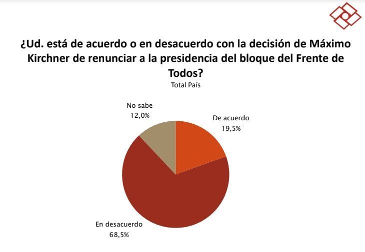 Por otra parte, la decisión de Máximo Kirchner de abandonar la presidencia del bloque del oficialismo y, en consecuencia, abrir una brecha interna dentro de la coalición gobernante; según Rouvier, no es acompañada por los votantes. El 68,5% desaprueba la movida y sólo el 19,5% está de acuerdo.