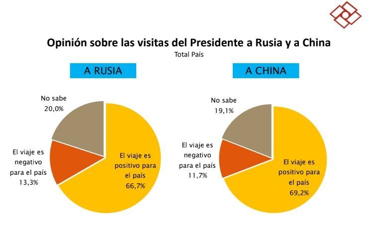 Los mismos consultados se manifestaron a favor de la oralmente polémica gira presidencial que Alberto Fernández cerró la semana pasada por Rusia y China, y que hasta este fin de semana continuaba generando debates; al menos entre el círculo rojo. En este caso, se contesta que la gira por el primer destino es en un 66,7% positiva para el país, mientras que en el segundo el porcentaje alcanza el 69,2%. Sólo el 13,3% y el 11,7% respectivamente lo piensan como un viaje negativo.