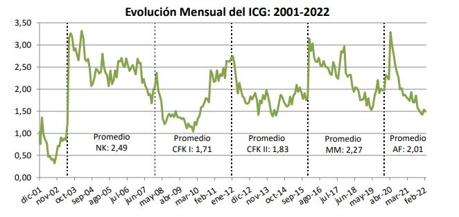 Concretamente, el ICG de febrero 2022 fue de 1,49 puntos, con una variación negativa de 3,2% respecto al mes de enero. En términos interanuales el índice tuvo una disminución de 18%. El nivel de confianza actual es 24% inferior al de la última medición del Gobierno de Mauricio Macri (diciembre de 2019), y 36% menor al del primer mes completo del Gobierno de Alberto Fernández (enero de 2020).