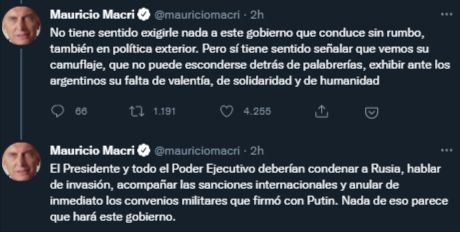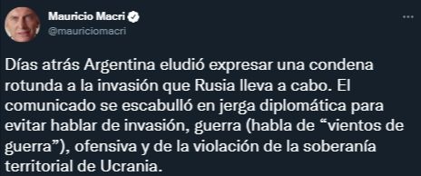 El expresidente Mauricio Macri volvió a utilizar sus redes sociales para cuestionar la postura del gobierno nacional con respecto a la invasión rusa en Ucrania.