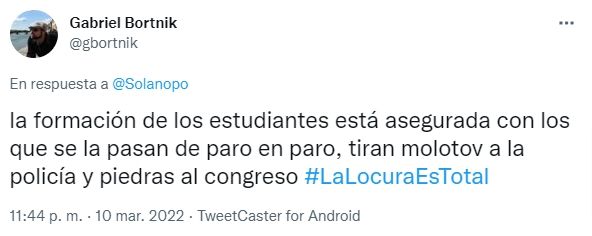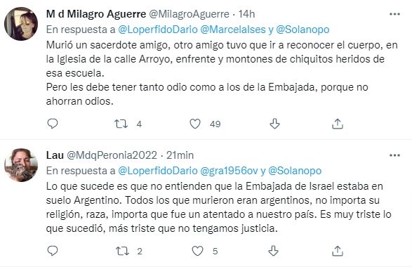 También respondió el columnista y ex director del Teatro Colón Dario Lopérfido que comentó que "Murieron ciudadanos en ese atentado, Solano. No es adoctrinamiento, es homenaje. Vos hiciste tu carrera adoctrinando jóvenes a favor de un asesino de masas como Trotsky. Trata de reflexionar aunque te cueste. Cariños!". Algunos usuarios aprovecharon la respuesta de Lopérfido para contar historias personales y compartir su opinión: