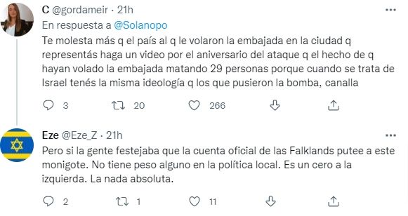 "Rechazó un video sobre un atentado terrorista en donde murieron ciudadanos argentinos. El antisemitismo champagne es así", le contestó un reconocido humorista gráfico en Twitter (Bernardo Erlich). Ante esta respuesta, Solano respondió "Nosotros rechazamos, denunciamos y reclamamos justicia tanto por el atentado a la Embajada de Israel como a la AMIA. Nosotros no espiamos a los familiares de las víctimas como hizo Macri. Pero jamás vamos a darle al Estado terrorista de Israel la formación de los estudiantes".