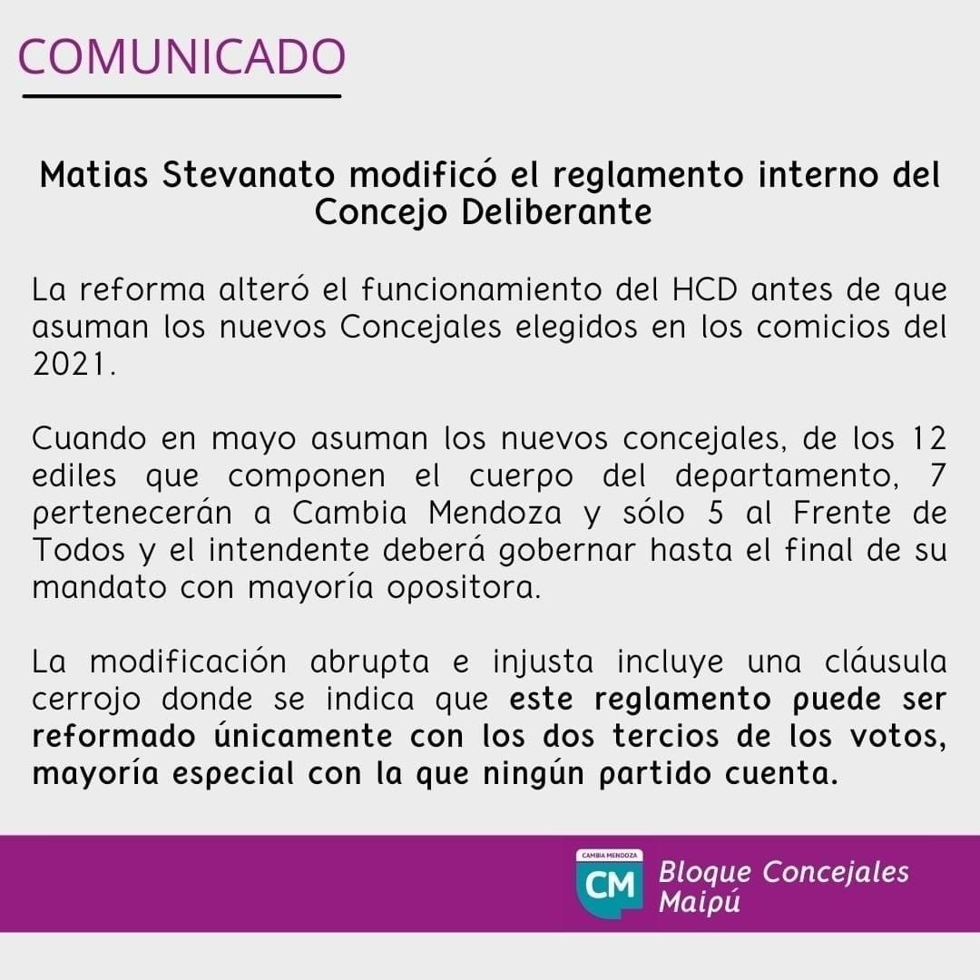 En el Municipio de Maipú, el bloque de concejales maipucinos de Cambia Mendoza denuncian que Matías Stevanato, intendente peronista, ha modificado el reglamento interno del Concejo Deliberante. Este reglamento puede ser reformado únicamente con los dos tercios de los votos, mayoría especial con la que ningún partido cuenta.