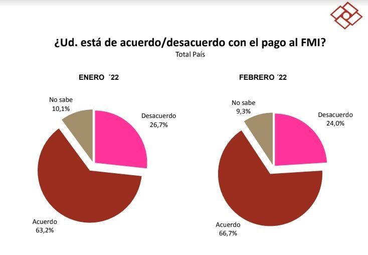 Según el informe de marzo 2022 de Rouvier, el 66,7% de los consultados está de acuerdo con el pago al FMI (a través de la reestructuración aprobada en el Congreso), mientras que el 24% se manifiesta en desacuerdo. En el caso puntual del acuerdo cerrado por el Gobierno y que se convertiría en ley esta semana, el aval de la encuesta llega al 63,2%. Esto implica que el porcentaje general supera en alcance a los votos del oficialismo, aún contabilizado de manera completa; pero además incluye gran parte de la oposición.