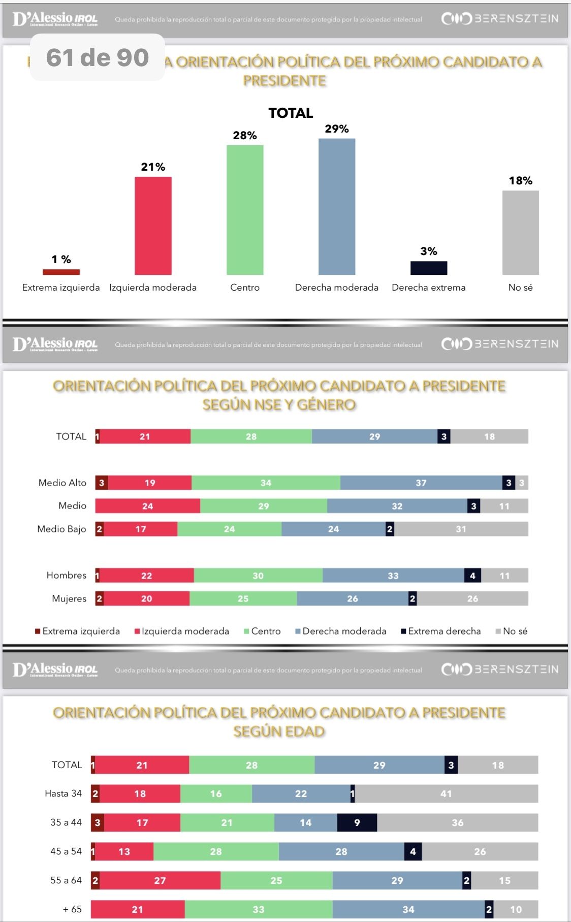 Según el último sondeo de la consultora D´Alessio IROL a nivel nacional, un 29% prefiere que la orientación ideológica del sucesor de Alberto Fernández sea de “derecha moderada”, 28% de centro, 3% de “derecha extrema”, 21% de izquierda moderada” y sólo un 1% de “extrema izquierda”. Conclusión: el 57% de los consultados optan por un jefe de Estado de “centro derecha moderada”, relegando al progresismo o a la centroizquierda.