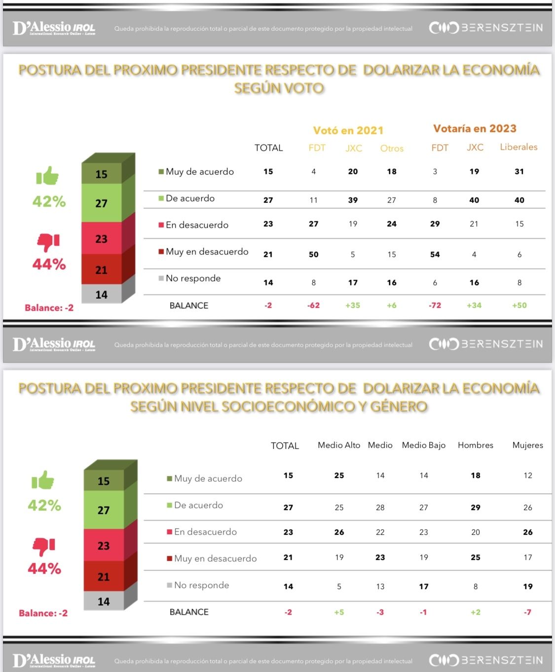 Respecto a los atributos que debería tener ese presidente, el 47% quiere que mantenga los planes sociales sólo por 6 meses, pero luego la gente debe ir a buscar trabajo, el 66% está de acuerdo que implemente una dolarización o un sistema de convertibilidad, el 53% aprueba la pena de muerte, el 72% está en contra de la legalización de las drogas.