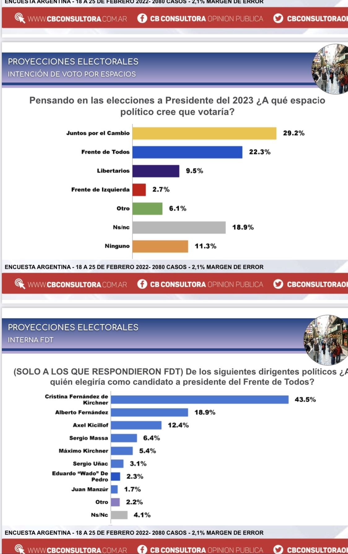 Consultados los votantes del oficialismo, el 43,5% quieren a Cristina como candidata a presidenta, sólo un 18,9% optan por Alberto, un 12,4% elige a Axel Kicillof, 6,4% por Sergio Massa, 5,4% a Máximo Kirchner y un 3,1% a Sergio Uñac.