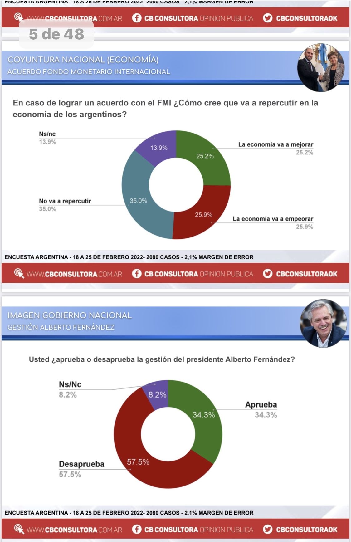 De acuerdo al último sondeo de CB Consultora, un 35% de los consultados aseguran que el acuerdo con el FMI no va a repercutir en la economía y un 25,9% que va a empeorar. Apenas un 25% considera que va a mejorar. Todo parece indicar que la opinión pública percibe esta negociación como “un mal necesario” pero sigue siendo muy pesimista, sobre todo porque el 60% dice que el Gobierno de Fernández no sabe cómo resolver los problemas del país.