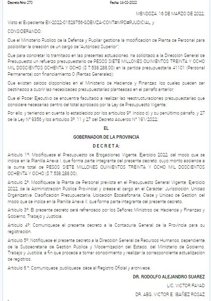 Según consta en el Boletín Oficial, se autorizó la creación de un cargo de "autoridad superior" con una partida anual de 7.5 millones de pesos. "Existen saldos disponibles en el Ministerio de Hacienda y Finanzas, los cuales pueden ser destinados a cubrir las necesidades presupuestarias planteadas en el párrafo anterior", remarca el decreto firmado por Rodolfo Suarez en el que el Ejecutivo habilita la reestructuración necesaria.