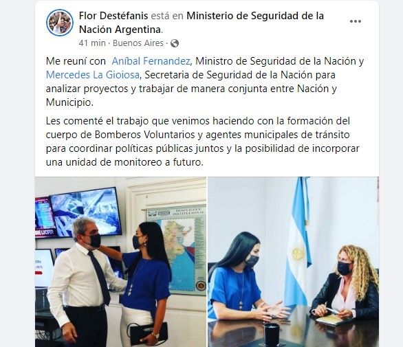 “Me reuní con Aníbal Fernández, Ministro de Seguridad de la Nación y Mercedes La Gioiosa, Secretaria de Seguridad de la Nación para analizar proyectos y trabajar de manera conjunta entre Nación y Municipio”, publicó en sus redes sociales la dirigente peronista del Este provincial.