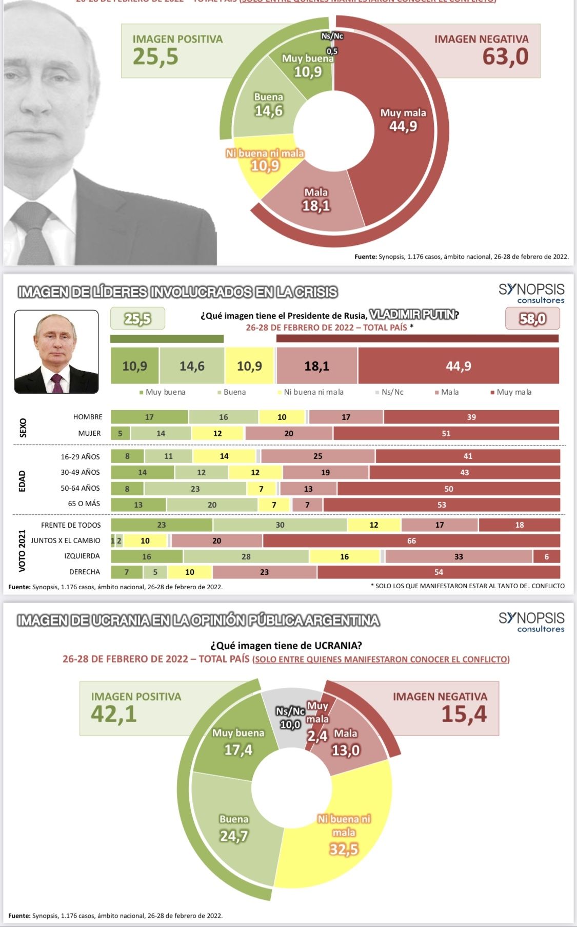 De acuerdo al último sondeo de la consultora Synopsis, el 58% de los argentinos tienen una imagen negativa de Putin, mientras que un 25,5% lo respalda. Mientras que el 65,2% rechaza la invasión militar a Ucrania y un 23,1% tiene una evaluación positiva. Paradójicamente, el presidente de Rusia genera menos rechazo que el conflicto bélico que ha generado en el este de Europa.
