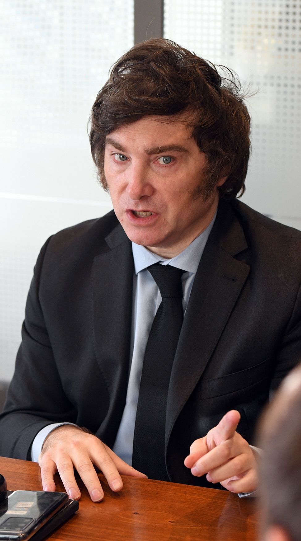 Milei lució su clásica campera de cuero negra que lo acompaña en cada acto público. Lo que llamó la atención fue que debajo tenía un chaleco antibalas, un elemento absolutamente inusual entre los políticos argentinos.