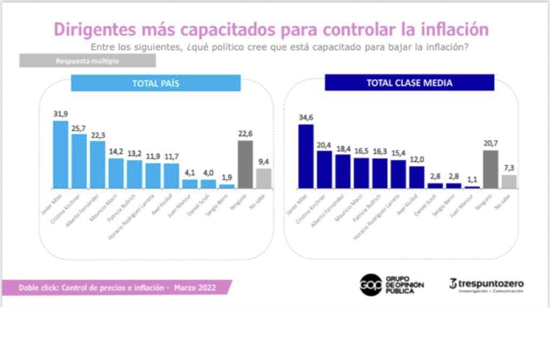 Paralelamente, Shila Vilker de la consultora Trespuntozero agrega números inquietantes: Milei lidera la lista a nivel nacional de los dirigentes más capacitados para controlar la inflación y medido en la clase media su credibilidad para enfrentar la suba de precios crece contundentemente llegando a un 34,6%. “Esto abre una posibilidad de crecimiento, mientras la inflación sigue en la agenda política”, plantea Vilker.