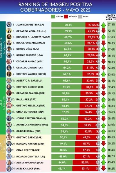 Por un escaso margen porcentual, el mendocino salió del podio del ranking. Este pedestal quedó liderado por el cordobés Juan Schiaretti con el 70,1%; el jujeño Gerardo Morales con el 69,9% y el jefe de Gobierno porteño Horacio Rodríguez Larreta con el 68,7%.
