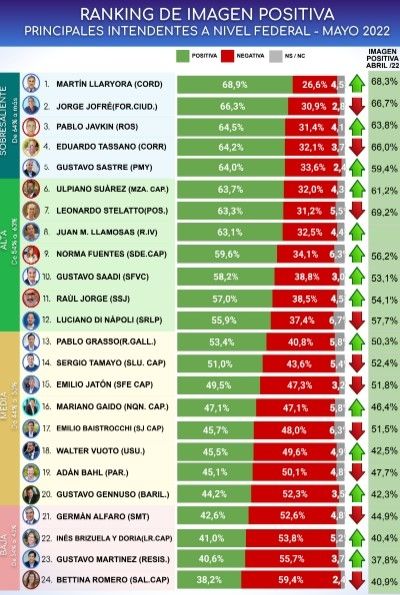 Quien más aumentó su imagen positiva con respecto al mes anterior es Gustavo Saadi de San Fernando del Valle de Catamarca (+5,1%), mientras que Leonardo Stelatto de la ciudad de Posadas es quien más bajó su imagen con respecto al mes de Abril (-5,9 puntos).