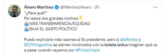 "¿Para qué cambiar de sistema? Por estos grandes motivos: más transparencia y equidad; baja del gasto político. Puedo explicarle más razones al presidente pero si Alberto Fernández y Cristina Fernández de Kirchner se sienten incómodos con la boleta única imaginen qué va a pasar cuando vayamos por Ficha Limpia", disparó el diputado nacional del PRO Álvaro Martínez.