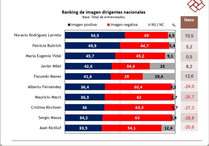 El ranking de imagen positiva, por parte de la opinión pública argentina, sigue siendo liderado por los políticos de la oposición conformada por la coalición de Juntos por el Cambio (JxC). Horacio Rodríguez Larreta se destaca en el primer lugar, seguido de Patricia Bullrich, Mauricio Macri y María Eugenia Vidal. Además, los números de Juntos por el Cambio parecieran no sacarle mucha ventaja a la figura de Javier Milei. El político libertario ocupa el cuarto lugar, haciéndose más conocido entre la opinión pública y mostrando una imagen positiva que supera el 40%.
