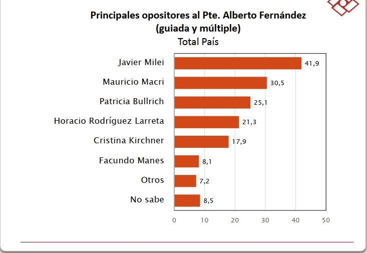 En ese ránking, elaborado a partir de una encuesta de Ricardo Rouvier, el ahora diputado nacional de Avanza Libertad aparece como el principal opositor al kirchnerismo incluso por encima de "halcones" del PRO como Mauricio Macri y Patricia Bullrich. Pero Milei también es percibido como el principal opositor superando en la opinión pública a Horacio Rodríguez Larreta y también al radical Facundo Manes. La particularidad de esta encuesta también ubica a Cristina Fernández de Kirchner como opositora a Alberto Fernández.