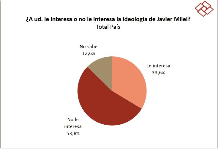 Analizando el caso Milei tenemos que, en primer lugar, a más de la mitad de los consultados en todo el país, no les interesa la ideología del candidato libertario, pero a un poco más de un tercio sí les interesa. Respecto a su posicionamiento ideológico, más del 65% señala que es de derecha o de centro derecha y hay un 30% que no contesta o no sabe.