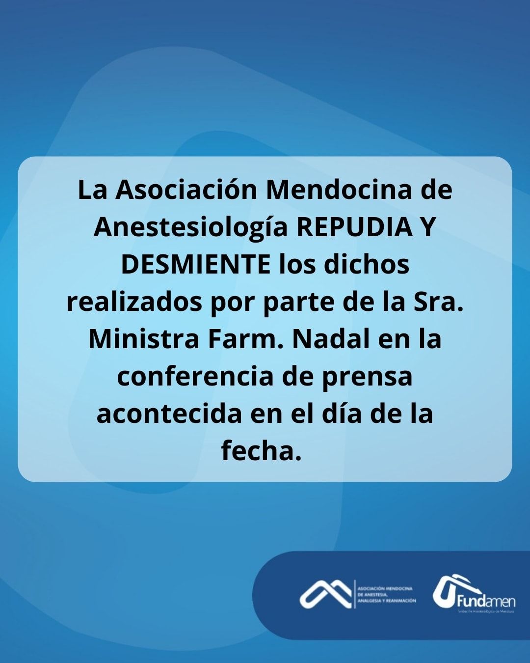 A través de un comunicado, desde AMA (Asociación Mendocina de Anestesiólogos), señalaron: "Desmentimos las tergiversación que efectúa la señora ministra al insinuar que AMA monopoliza los puestos de trabajo, impidiendo el acceso a otros profesionales":