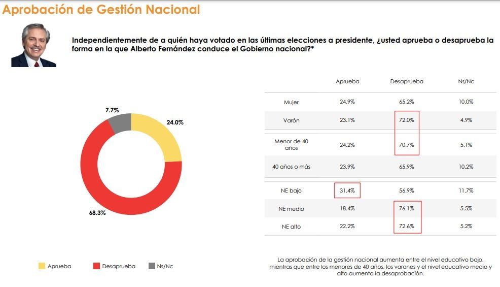 Al ser consultado sobre la gestión del presidente, el 68% desaprueba el manejo de Alberto Fernández y sólo el 24% lo aprueba, un nivel solo comparable con octubre del 2019, cuando gobernaba al final de su mandato Mauricio Macri. Sólo Máximo Kirchner tiene peor imagen que el Presidente: el porcentaje de relación de imagen positiva y negativa le otorga al diputado por la provincia de Buenos Aires un nivel de 60,7%.