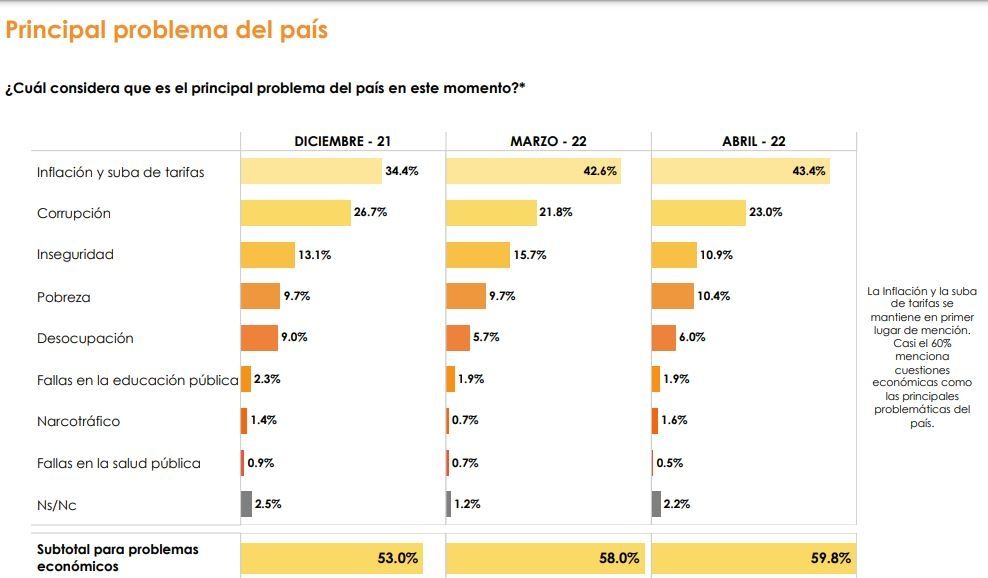 La inflación sigue siendo el principal problema para los consultados, con un 43,4% del total, seguido por lejos por el 23% de la inseguridad y el 10,9% de la corrupción.