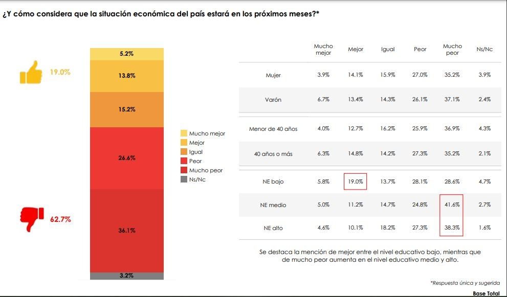 Las cosas tampoco mejoran, según M&F, cuando lo que se consulta es sobre lo que se espera para el futuro. Las respuestas negativas trepan al 62,7%, divididas en un 36% mucho peor y un 26,6% como peor. Sólo el 19% tiene esperanzas en que las cosas mejores.