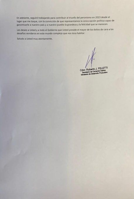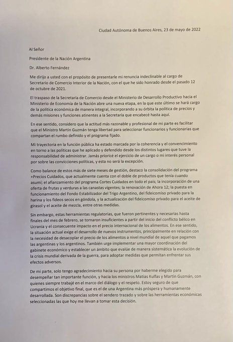 "Me dirijo a usted (Alberto) con el propósito de presentarle mi renuncia indeclinable al cargo de Secretario de Comercio Interior de la Nación, con el que he sido honrado el pasado 12 de octubre de 2021", comenzó describiendo el ahora exfuncionario.