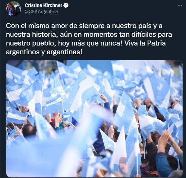 "Con el mismo amor de siempre a nuestro país y a nuestra historia, aún en momentos tan difíciles para nuestro pueblo", señaló CFK a través de Twitter, pocos días después de que el secretario de Comercio, Roberto Feletti, dejara el Gabinete tras enfrentarse a la política económica que lleva adelante el ministro de Economía, Martín Guzmán.