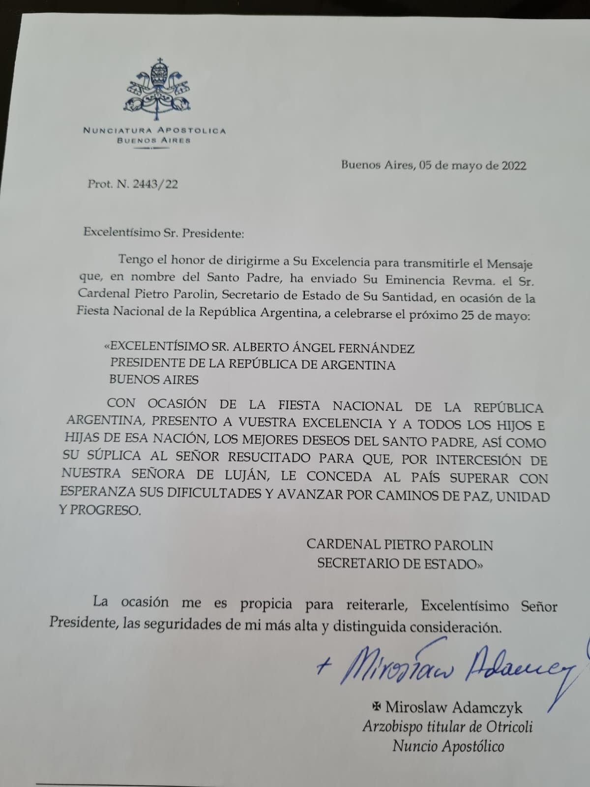 Sin la firma de Jorge Bergoglio, el Vaticano le envió una carta a Alberto Fernández con motivo de la conmemoración de la fecha patria por el 25 de Mayo. El Gobierno nacional recién la difundió ayer pero la misiva está fechada el 5 de mayo pasado y fue presentada por el arzobispo titular de Otricoli, el Nuncio Apostólico Mirolaw Adamczyk: "Tengo el honor de dirigirme a su excelencia para transmitirle el mensaje que, en nombre del santo padre, ha enviado su eminencia revma, el Sr. cardenal Pietro Parolin, secretario de Estado de su santidad, en ocasión de la Fiesta Nacional de la República Argentina, a celebrarse el próximo 25 de mayo".