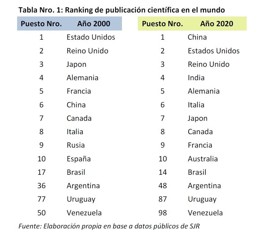 Según la SCImago Journal Rank, organismo privado que cura una base datos sobre la producción científica, Argentina en el año 2000 se ubicaba en el puesto número 36 en la publicación de papers, citas y descubrimientos y más tarde tomó asiento en el puesto 48. Uruguay y Venezuela también han caído varios peldaños. Venezuela se ubicaba en el lugar 48 para hoy verse en el espejo con un número 98 pintado en la frente.
