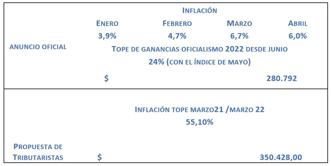 Los tributaristas consideramos que ni el propuesto por el presidente de la Cámara de Diputados ni por el Ministro de Economía es actualizable ni beneficio para la clase media trabajadora que sigue perdiendo su poder de compra, donde su salario cada vez se ve más empobrecido. Aconsejamos que el nuevo monto de mínimo no imponible del año fiscal 2022 de ganancias de los dependientes resulte de lo que arrojó la inflación interanual de marzo 2021 a marzo 2022, que asciende a 55.1%.