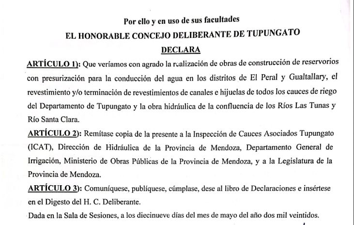 Desde el Concejo Deliberante marcaron que "el laudo será desfavorable para Mendoza. Las obras hidráulicas son de vital importancia para el desarrollo de las comunidades, sobre todo para una comunidad como la de Tupungato que tiene un principal sustento con la agricultura".