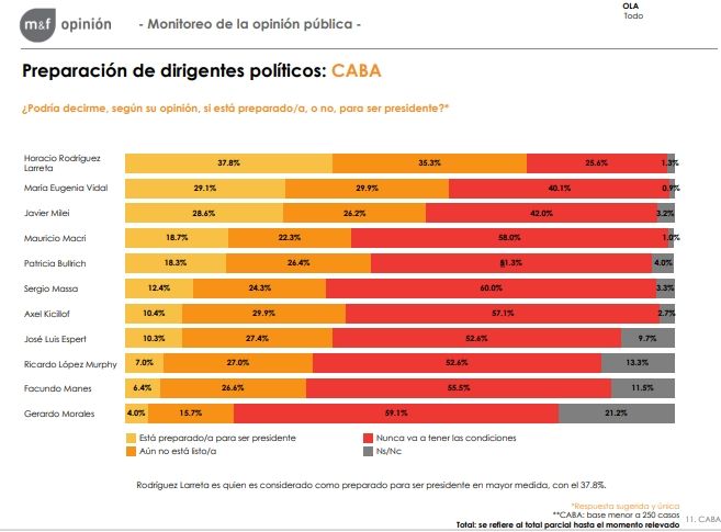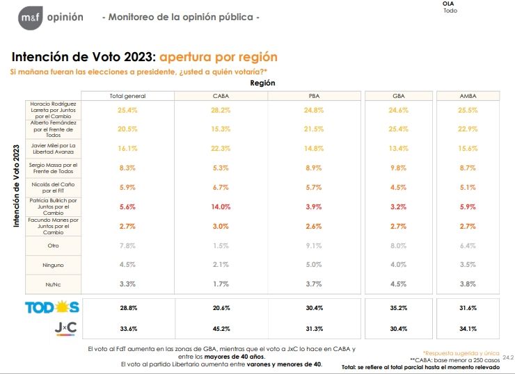 El sondeo llevado a cabo entre el 10 y 24 de mayo tomó como muestra a 1.340 casos de la Ciudad Autónoma de Buenos Aires, provincia de Buenos Aires (PBA), Gran Buenos Aires (GBA) y el Área Metropolitana de Buenos Aires (AMBA). Entre los aspectos destacados, se encuentra la intención de voto a través de la consigna "si mañana fueran las elecciones a presidente, ¿usted a quién votaría?". Allí, Rodríguez Larreta obtuvo un total de 25,4%, superando al actual jefe de Estado, Alberto Fernández, que se posicionó como segundo favorito con 20,5%.