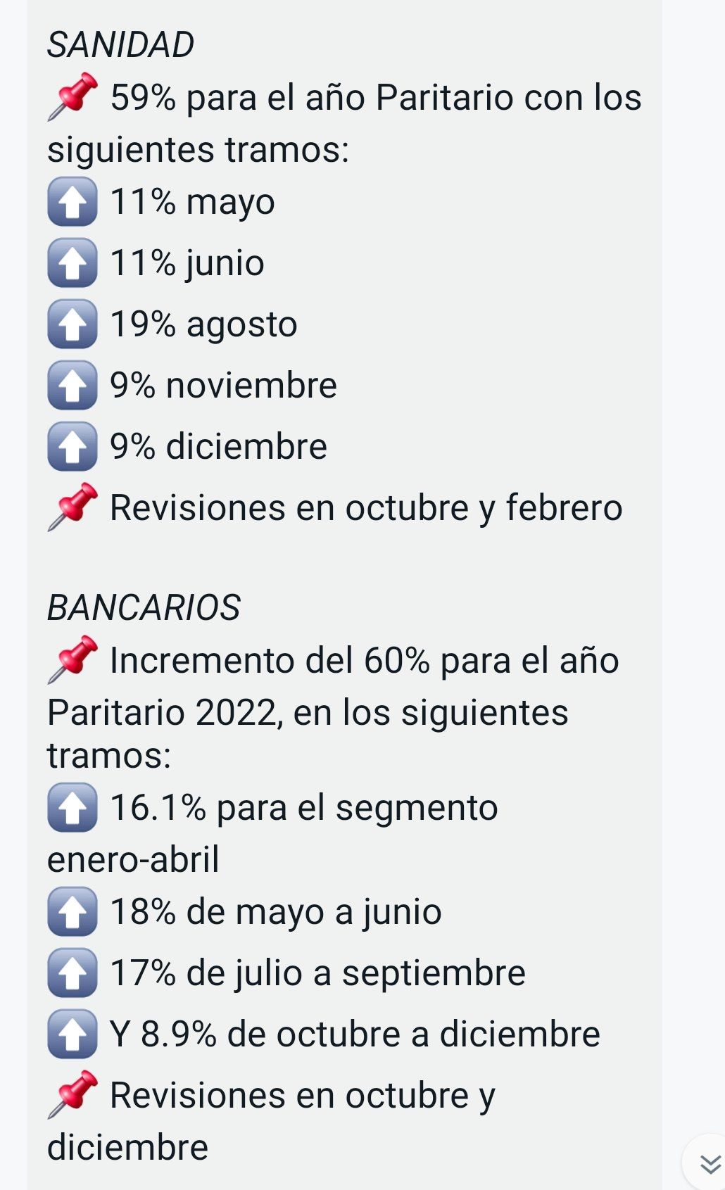La Bancaria, liderada por el diputado kirchnerista Sergio Palazzo, cerró su acuerdo paritario para 2022 con un aumento de salarios de 60%, distribuido en cuatro tramos y con dos revisiones. Acuerdo que fue festejado por Cristina Fernández de Kirchner en redes sociales como mensaje elíptico a Guzmán y también a Alberto Fernández. El ajuste salarial se realizará en cuatro tramos: 16,1% para el segmento enero-abril; 18% de mayo a junio; 17% de julio a septiembre; y 8,9% de octubre a diciembre. Además habrá dos revisiones en octubre y noviembre para evaluar el impacto de la inflación. De esta forma el sueldo inicial tendrá la siguiente progresión: enero $ 141.995,51; abril $ 164.010,33; julio $ 184.802,10; octubre $ 195.687,20. El retroactivo al 1° de enero se deberá abonar antes del 15 de mayo. Además se fijaron gastos diarios por conectividad de $ 160.