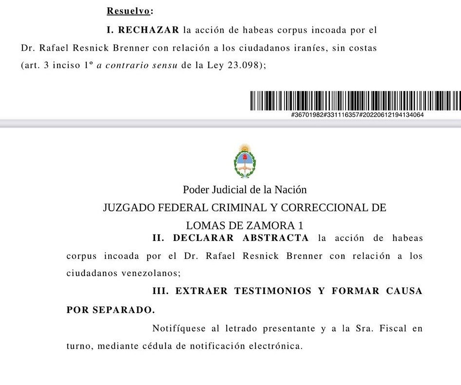 Aun con esta resolución, los cinco tripulantes pueden salir del país. En ella el magistrado afirmó que "si los tripulantes de nacionalidad iraní se presentaren ante la DNM (Dirección Nacional de Migraciones) haciendo saber que se irán del país, los pasaportes les serán entregados en forma inmediata y concomitante al egreso del territorio nacional".