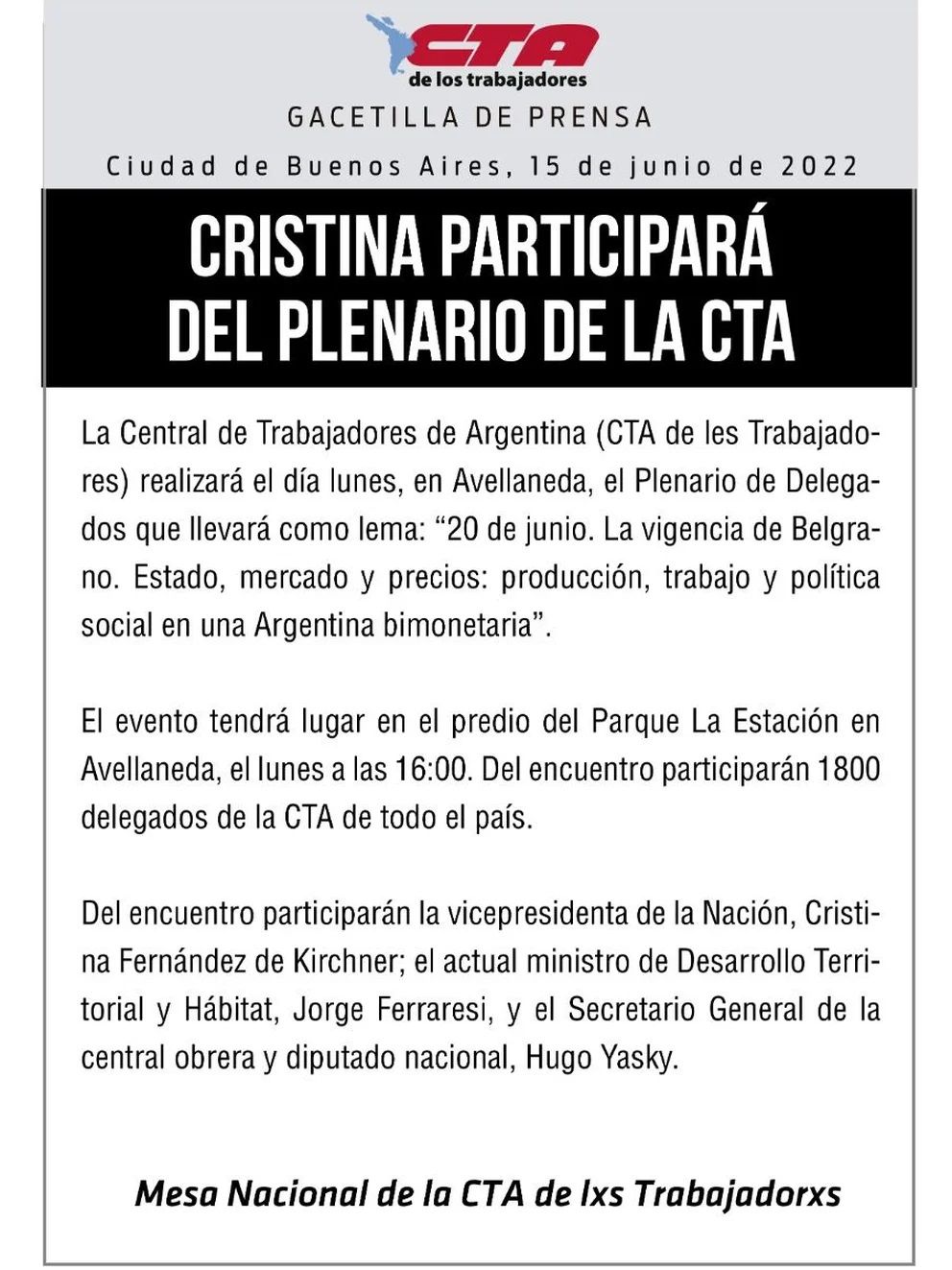 La vicepresidenta de la Nación, Cristina Fernández de Kirchner, volverá a hacer una aparición pública formando parte del plenario de delegados de la CTA de los Trabajadores, una organización liderada por el diputado del Frente de Todos, Hugo Yasky. Además del encuentro sindical pautado para este lunes el 20 de junio, se llevará a cabo un acto con motivo de la celebración del Día de la Bandera.