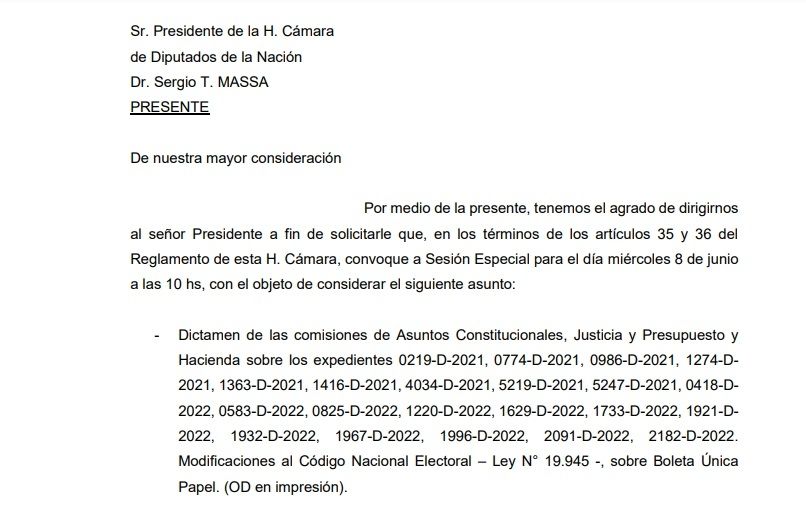 Todos ellos firmaron el pedido de sesión especial para el miércoles 8 de junio a las 10 de la mañana con el objeto de tratar las modificaciones al Código Nacional Electoral sobre Boleta Única Papel.