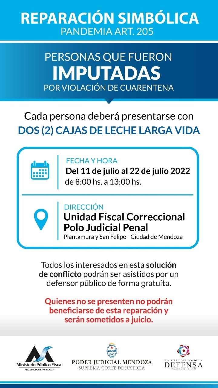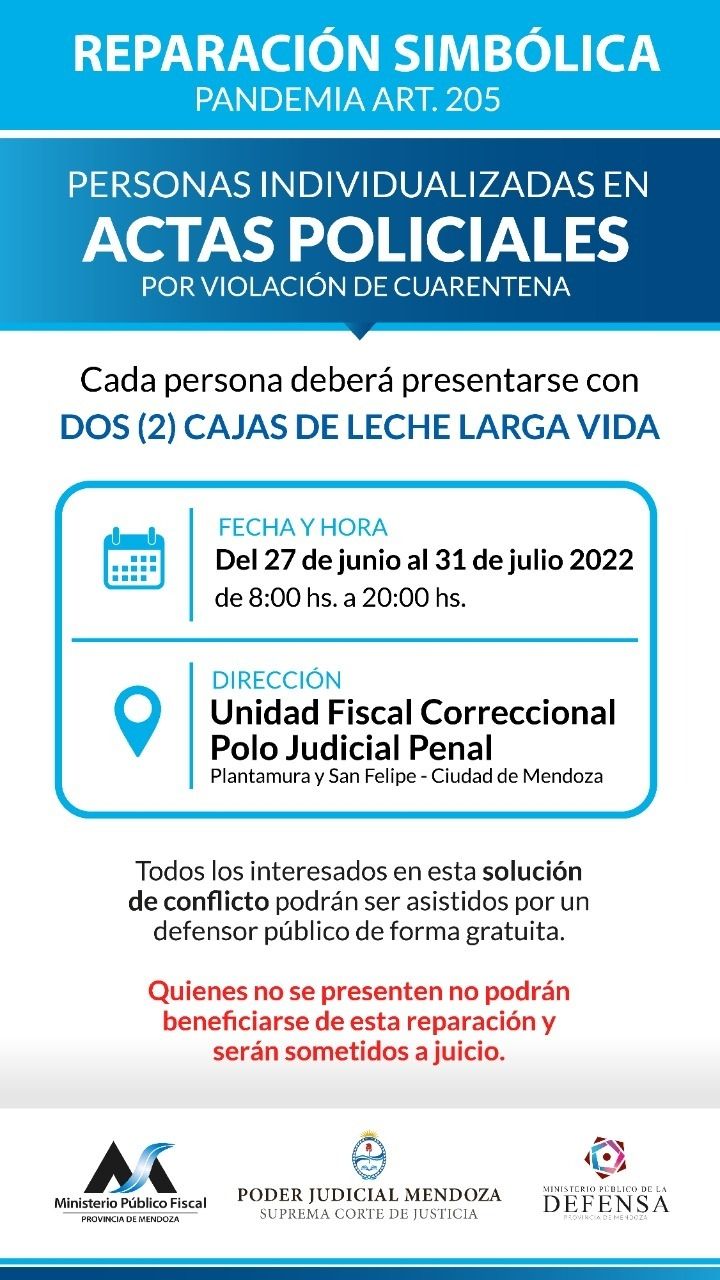 Cada persona individualizada en actas policiales por violar la cuarentena deberá presentarse este lunes con dos cajas de leche larga vida en polvo de cualquier marca y de 800 gramos. A partir de las 08:00 y hasta las 20:00 horas se podrá entregar el alimento en la Unidad Fiscal Correccional del Polo Judicial Penal ubicado en Plantamura y San Felipe, Ciudad de Mendoza. Hay tiempo hasta el 31 de julio.