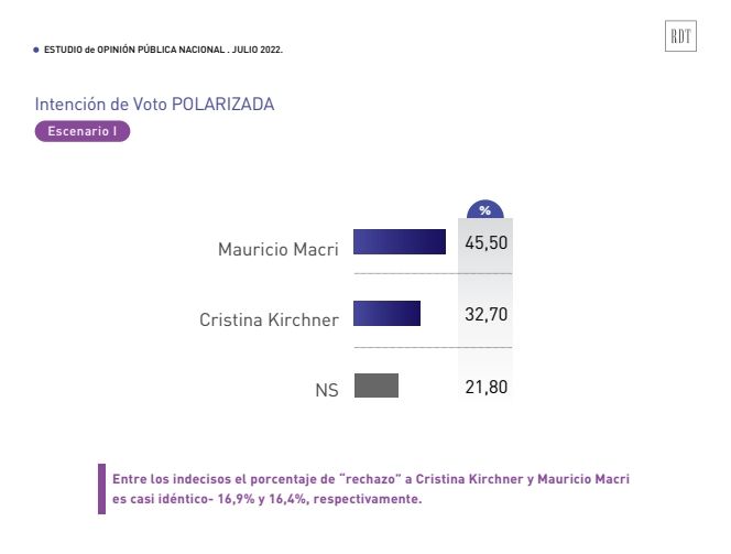 Mauricio Macri obtuvo un 45,50% de intención de voto, mientras que Cristina Kirchner 32,70%. En tanto, 21,80% se inclinó por la opción de no saber.