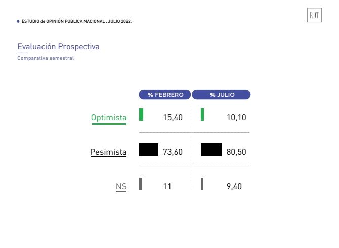 "El nivel de expectativa respecto de una mejora en la situación económica, continúa en caída libre. El pesimismo creció 6,9% en el último semestre. Hoy el 80,5% de los encuestados visualiza un futuro sombrío para el país", detalla el estudio.