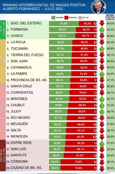 Una encuesta llevada adelante por CB Consultora Opinión Pública, la cual forma parte del informe interprovincial julio 2022 en el que se miden la imagen de dirigentes nacionales provincia por provincia, revela un preocupante dato para la actual fórmula presidencial encabezada por Alberto Fernández y Cristina Fernández de Kirchner.