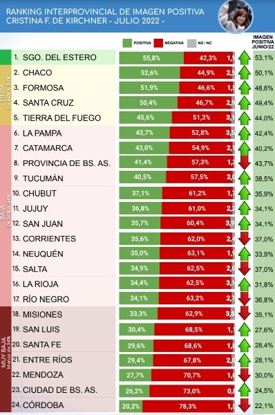 Donde más aumentó su imagen positiva con respecto al mes anterior es la Provincia de Formosa (+2,6% puntos), mientras que en Provincia de Santa Fe es donde sufrió la mayor caída (-3,2% puntos ).