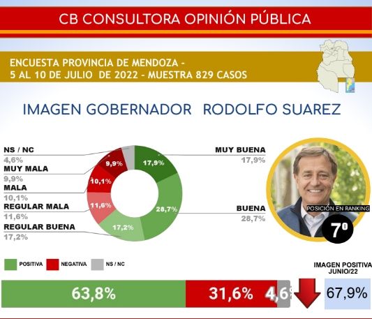 En concreto, Suarez, quien es sucesor del actual senador nacional Alfredo Cornejo, obtuvo una imagen positiva de 63.8% y una negativa de 31,6%. 4,6% optó por no contestar a la consigna. De esta manera se confirma una caída del 4,1% en su reputación, tomando como referencia las estadísticas proporcionadas por la misma consultora en su informe de junio.