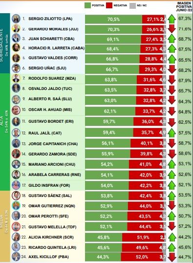 En tanto, el escrito de CB Consultora indica que los tres gobernadores mejores valorados en sus provincias durante el mes de julio son: Sergio Ziliotto de La Pampa (70,5%), Gerardo Morales de Jujuy (70,3%) y Juan Schiaretti de Córdoba (69,1%)